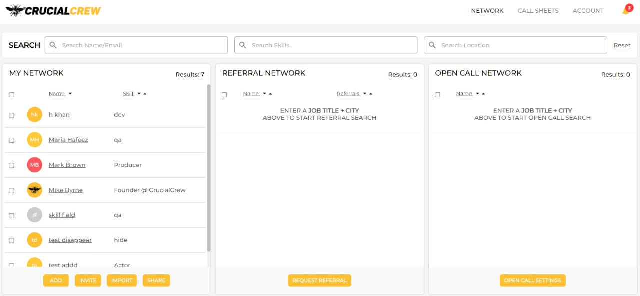 Crucial crew is a website made for users to create social networks based on skill and location. It allows them to refer, search and connect with people of various skills asper their availability and location to work. Users are registered and categorized as per their skill sets. In a case where one is not able to find a right fit for the job, they can request someone from their network for referrals and suggestions.